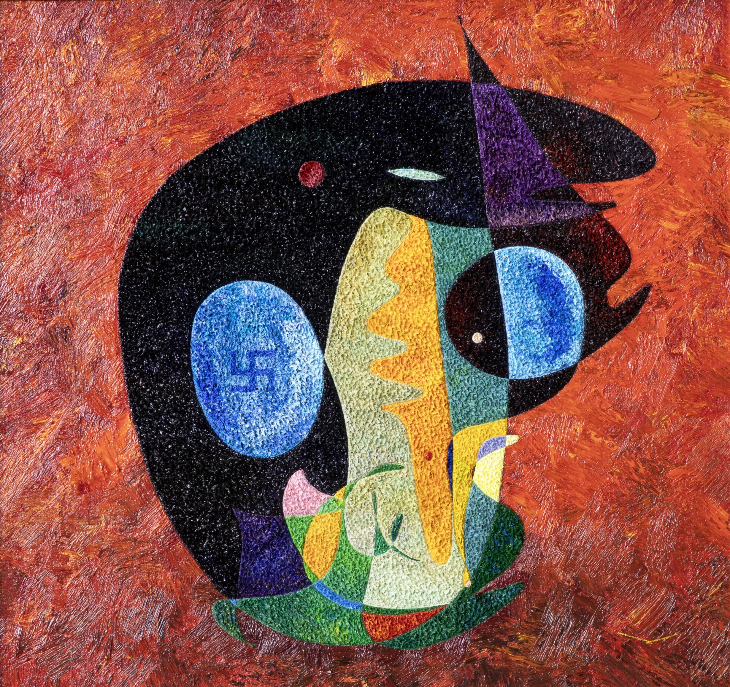 La figura central se divide en dos “epóstasis” coexistentes. La primera se asemeja a un cerdo, con dos ojos distintos y un hocico apenas indicado; un ojo contiene una esvástica, simbolizando la corrupción ideológica internalizada. La segunda es un perfil con un peinado contemporáneo estilizado, que hace referencia a la personalización del poder y al aspecto performativo del liderazgo moderno. Estas formas duales están parcialmente envueltas por una masa negra, que representa los mecanismos ocultos de la autoridad.